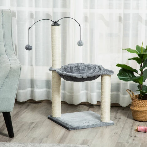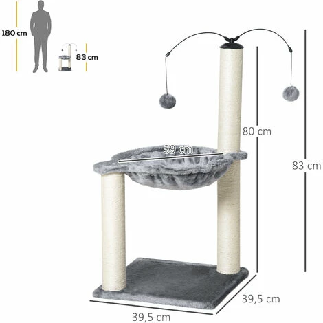 Ce magnifique arbre à chat design coloris gris doté de 3 griffoirs, d’un hamac et d’un jeu de 2 boules suspendues permettra à votre animal de jouer, se reposer, et s’épanouir pleinement. Caractéristiques : – Arbre à chats design coloris gris très élégant pour intégration dans l’espace intérieur de votre choix – Equipements multiples : 2 griffoirs, hamac, jeu de 2 boules suspendues, plateforme base – Revêtement en peluche haute densité 400 g/m² d’une grande douceur, griffoirs en sisal naturel – Arbre à chat idéal pour que votre chat s’amuse, se repose et joue à volonté – Jeu de boules suspendues pour exercer votre chat et développer ses capacités motrices – Conception et fabrication de qualité pour un usage pérenne (structure en panneaux de particules classe E1) Spécifications : – Couleur : gris – Matériaux principaux : panneaux de particules classe E1, peluche courte 100% polyester, sisal naturel – Dim. totales : 39,5L x 39,5I x 83H cm – Dim. base : 39,5L x 39,5l cm – Ø hamac : 39 cm – Ø boules : 5 cm – Ø poteaux : 7,9 cm – Livraison effectuée en un colis – Réf. : D30-292V01