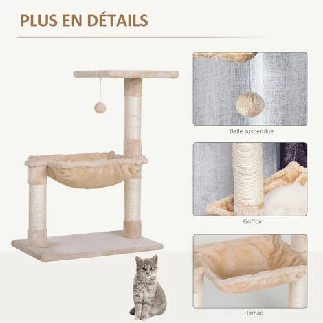 Ce magnifique arbre à chat design coloris beige doté d’une plateforme, de 3 griffoirs, grattoirs, d’un hamac et d’un jeu de boule suspendue permettra à votre animal de jouer, se reposer, et s’épanouir pleinement.