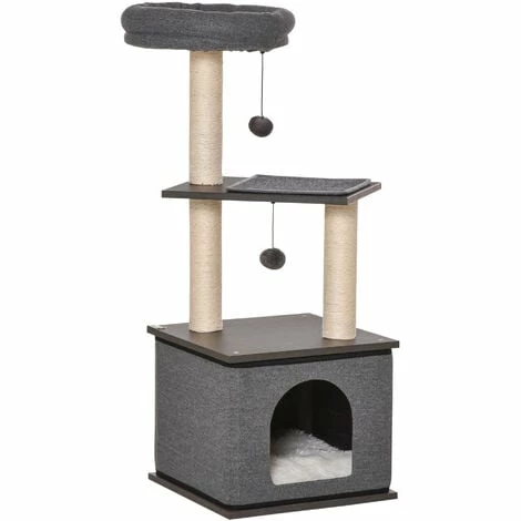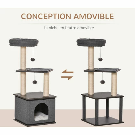 – Equipements multiples : 1 niche, plateformes, griffoirs, grattoirs, panier et 2 jeux de boule suspendue