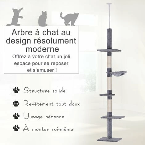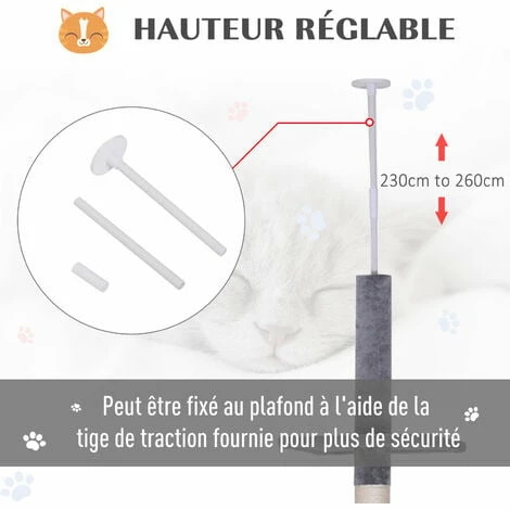 Votre boule de poils peut s’amuser tous les jours avec cet arbre à chat. Ce griffoir équipé de 5 niveaux de différentes tailles est le modèle idéal pour d’excellents moments d’amusement. Ce modèle haut de 2,3 à 2,6 mètres permet à votre petit compagnon de se dépenser ou de se faire les griffes sans avoir à s’attaquer à vos meubles. Grâce à sa conception avec des matières non toxiques, ce poteau à griffer est sans risque pour la santé de votre animal domestique.