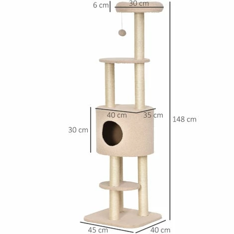 Répondez aux instincts naturels de votre chat en toute sécurité avec cet arbre à chat de PawHut ! Ce centre multi-activités doté des poteaux à gratter recouverts de sisal naturel, une boule suspendue, un niche doux et confortable et des perchoirs. Le grattoir pour chat profite à la fois à l’animal et aux propriétaires en fournissant un endroit pour soulager le désir des chats de griffer et de grimper et de sauver vos tapis et meubles de maison des dommages. Reposer, jouer, faire de l’exercice, vos chats peuvent y passer toute la journée, une unité confortable pour vos amis poilus. Caractéristiques : – Doté d’une balle amusante sur l’arbre à chat pour le divertissement de votre chat – Recouvert de peluche courte haute densité, vos chats adoreront ce toucher adapté aux félins et se reposeront dessus pendant des heures sans fin – La perche supérieure avec côtés rembourrés offre plus de confort – Les poteaux en sisal satisfont la nature des griffes de vos chats et protègent vos meubles des rayures – Assemblage simple nécessaire Spécifications : – 2 coloris au choix : beige ou gris – Matériaux : panneau de particules de classe E1, peluche courte, sisal – Dim. totales : 45L x 40L x 148H cm – Dim. base : 45L x 40l cm – Dim. plateforme (de bas en haut) : 25L x 20I cm, 36L x 28I cm, Ø 30 x 6I cm – Dim. niche : 45L x 35I x 30H cm – Diamètre porte niche : 18 cm – Diamètre poteau : 6,8 cm – Chargé max. recommandée : 30 Kg (au total), 4,5 Kg (niche) – Réf. : D30-271BG/GY