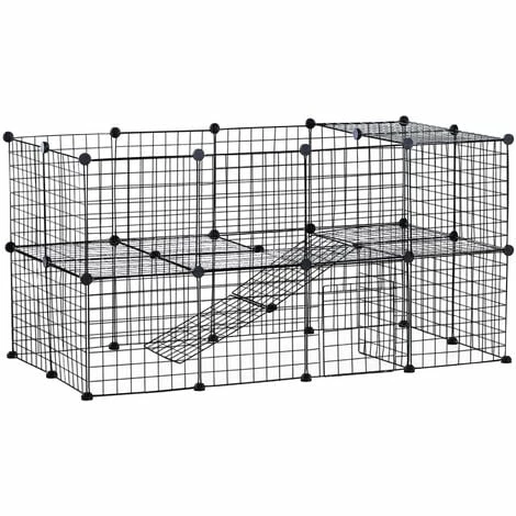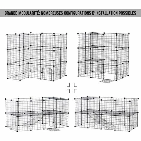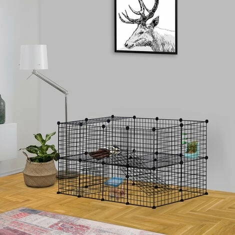 Cette cage pour animaux domestiques est l’accessoire idéal pour permettre à vos petits compagnons de s’amuser confortablement et en toute sécurité. Ce modèle est spécialement conçu pour les animaux de petite taille tels que les cobayes, les lapins ou les cochons d’Inde. Montez cet enclos pour animaux domestiques selon vos envies ou en fonction de la configuration de la pièce grâce aux connecteurs multi-angles. La structure en fil métallique avec bords arrondis est un gage de solidité tout en évitant aux animaux de se blesser.