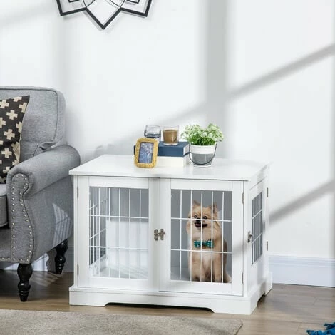 – Cage pour chien en MDF peint en blanc avec grilles en acier blanc