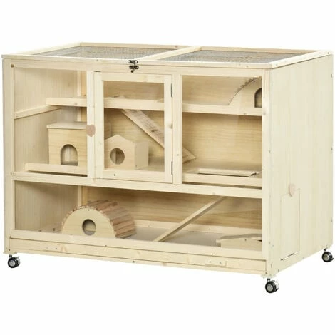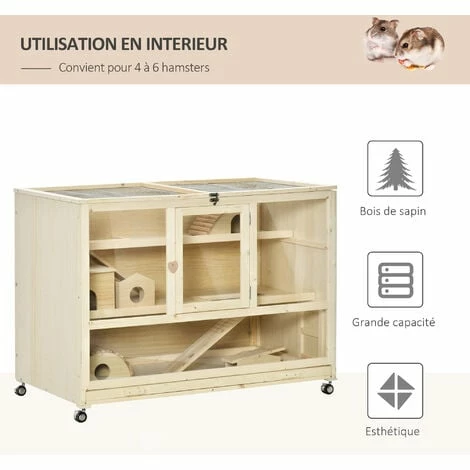 Cette superbe cage XXL sur roulettes pour hamsters, souris ou autres petits rongeurs offrira un habitat et espace de jeu idéal pour votre ou vos petits animaux. Fabriquée en bois de sapin atoxique, écologique, doté de 3 niveaux et de nombreux équipements (bascule, rampes, cottages, etc.), vos rongeurs pourront se défouler à volonté !
