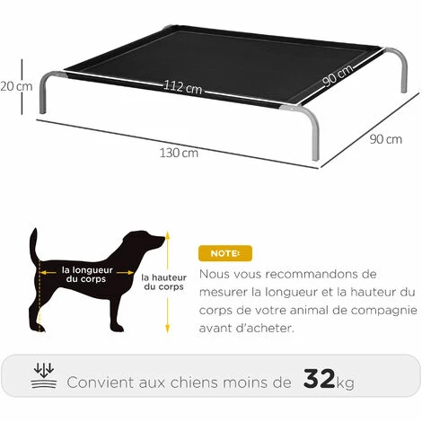 Ce joli lit sur pied bicolore gris clair noir apportera un confort inĂ©galĂ© Ă votre chien mĂŞme pendant les fortes chaleurs de l’Ă©tĂ© ! Sa conception et fabrication sur pied avec revĂŞtement de dernière gĂ©nĂ©ration en textilène haute densitĂ© 430 g/m² micro-perforĂ© permettra Ă votre animal de compagnie de se reposer au frais mĂŞme pendant les fortes chaleurs de l’Ă©tĂ©. CaractĂ©ristiques : – Lit XXL sur pied pour chien chat idĂ©al pour une utilisation intĂ©rieure ou extĂ©rieure (terrasse, jardin) – RevĂŞtement de dernière gĂ©nĂ©ration en textilène haute densitĂ© 430 g/m² micro-perforĂ© pour une excellente ventilation et le bien-ĂŞtre de votre animal mĂŞme par forte chaleur – Châssis en mĂ©tal Ă©poxy anticorrosion robuste pour un usage pĂ©renne en toute sĂ©curitĂ© – Lit sur pieds surĂ©levĂ© idĂ©al pour tenir votre chien Ă l’Ă©cart de l’humiditĂ© Ă©ventuelle du sol et des insectes : confort optimal de repos pour votre animal – Patins antidĂ©rapants installĂ©s sous chaque pied : stabilitĂ© optimisĂ©e mĂŞme si utilisation sur du parquet ou carrelage, aucun risque de rayure de votre sol SpĂ©cifications : – MatĂ©riaux principaux : mĂ©tal Ă©poxy anticorrosion, textilène – Couleurs : noir, gris – Dim. totales : 130L x 90l x 20H cm – Dim. surface de couchage : 112L x 90l cm – Hauteur du lit : 20 cm – Charge max. recommandĂ©e de 32 Kg – Livraison effectuĂ©e en un colis – RĂ©f. : D04-064V03BK