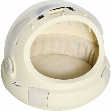 Choisissez cette maison pour chat portable PawHut qui vous permettra de transporter facilement, confortablement et en toute sécurité votre animal. Fournie avec un coussin amovible rembourré d’une peluche douce, c’est un espace de repos parfait pour vos amis à fourrure. Une ouverture de la porte avant, qui est pratique pour l’entrée de vos animaux de compagnie, et un loquet inclus empêchent les animaux de s’échapper. Fabriquée en PP, sa structure est résistante à une utilisation quotidienne. Caractéristiques : – Maison pour chat ronde portable style contemporain très élégant, idéale pour ajouter une touche d’originalité et de raffinement supplémentaire à votre intérieur – La porte avant permet un accès facile et le loquet assure la sécurité – Porte plastique transparent, évents d’aération multiples : excellente ventilation et visibilité pour le bien-être de votre chat – Le rembourrage doux en peluche crée un endroit confortable juste pour votre chat et l’installation simple pour un nettoyage facile – Poignée supérieure pour un transport facile. Les bords arrondis protègent votre animal des blessures – Léger et facile à déplacer (poids net à vide de 1,7 Kg) – Montage facile et rapide à l’aide du manuel d’assemblage illustré fourni Spécifications : – Couleur : beige – Matériaux principaux : PP, peluche courte – Dim. totales : Ø 41 x 35,2H cm – Dim. intérieures : Ø 38 x 28H cm – Dim. porte : 27,5L x 17H cm – Convient aux chats de moins de 3 Kg – Livraison effectuée en un colis – Réf. : D30-518