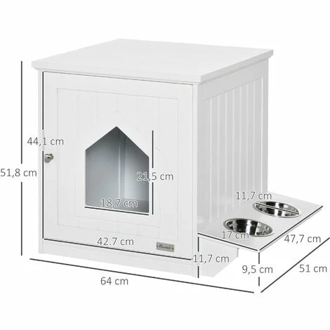 Cette jolie maison litière chat design permettra à votre animal d’avoir son petit cocon pour se cacher, jouer, observer ou se reposer. Dotée d’une entrée en forme de maison, de deux gamelles et d’un grand plateau supérieur, votre chat se sentira comme à la maison ! Caractéristiques : – Design contemporain très élégant, idéale pour ajouter une touche d’originalité à l’espace intérieur de votre choix : salon, cuisine, chambre, etc. – Maison blanc uni avec entrée à motif maison : sobriété, style unique – Offrez un superbe espace de vie et toilette pour le plus grand confort de votre chat – Fabrication avec des matériaux de qualité (MDF classe E1), usage pérenne – Excellent niveau de finition : portes avec fermetures magnétiques, poignée bouton, charnières solides – Deux gamelles sur le côté permettent de rassembler deux fonctions dans un même meuble – Montage facile et rapide à l’aide du manuel d’assemblage illustré fourni Spécifications : – Couleur : blanc – Matériau principal : MDF – Dim. totales : 64L x 51l x 51,8 Hcm – Espace intérieur : 43,2L x 46L x 44,6H cm – Dim. de la porte : 42,7l x 44,1 H cm – Dim. trou de la porte : 18,7l x 21,5 H cm – Charge max. recommandée : 20 kg (intérieur), 20 kg (haut), 5 kg (support de bol) – Livraison effectuée en un colis – Réf. : D31-037