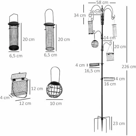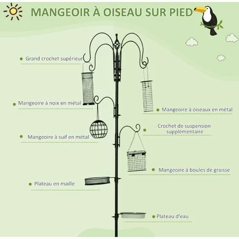 – Equipé de 6 crochets réglables, de 4 mangeoires (à graines, à cacahuètes, etc.), d’un plateau d’alimentation et d’un grand bain pour attirer de nombreuses variétés d’oiseaux à venir s’y poser