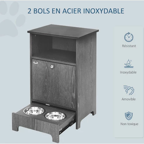 – Tiroir coulissant avec 2 gamelles acier inox. intégrées, idéal pour alimenter votre animal sans avoir des gamelles disgracieuses à portée de vue