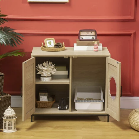 Cette jolie maison de toilette chat design permettra Ă votre animal d’avoir son petit cocon pour faire ses besoins, se cacher, jouer, observer ou se reposer. DotĂ©e d’une entrĂ©e ronde sur la façade d’une porte, d’un placard double porte avec Ă©tagère rĂ©glable et grand plateau supĂ©rieur, votre chat se sentira comme Ă la maison !