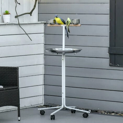 Ce joli perchoir sur pied est spécialement adapté pour les grandes perruches et les perroquets. Monté sur 4 roulettes, il est facile à déplacer. Avec sa structure en métal, ce perchoir mobile est stable et dispose d’un perchoir, de 2 mangeoires et d’un plateau en inox pour éviter au maximum que les graines ne tombent parterre. Caractéristiques : – Joli perchoir en métal blanc sur roulettes pivotantes à 360° : déplacement facile, pratique si besoin – Perchoir sur pied spécialement adapté pour les grandes perruches (Alexandre, à collier, etc.) et les perroquets (Gris du Gabon, Calopsittes ou autre) – Multi-équipement : comporte un perchoir, 2 mangeoires + plateau en acier inox. – Perchoir pensé pour le confort de votre oiseau et vous faciliter l’entretien lorsqu’il mange (mangeoires, plateau amovibles) – Montage simple et rapide à l’aide du manuel d’assemblage illustré fourni Spécifications : – Couleur : blanc – Matériaux principaux : métal, acier inox., bois – Dim. totales : Ø 45 x 118H cm – Dim. mangeoires : Ø 10 x 5,5H cm – Dim. plateau : Ø 45 cm (installé à 76 cm de hauteur) – Livraison effectuée en un colis – Réf. : D10-071