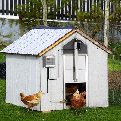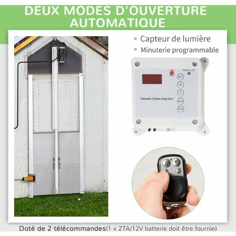 Offrez plus sécurité et de liberté à vos poules avec notre porte automatique PawHut. Cet accessoire ingénieux propose un mode d’ouverture par minuterie ou en fonction de la luminosité extérieure. Grâce à cette porte, vos poules seront protégées contre les prédateurs. Pratique, sûre et durable, sa conception en aluminium lui confère une grande résistance aux intempéries. Caractéristiques : – 2 modes d’ouverture : L’ouverture et la fermeture peuvent se faire en fonction de l’heure ou de la luminosité extérieure – La fonction de capteur infrarouge empêche vos animaux de compagnie de rester coincés – Équipé de deux télécommandes (1 pile 27A/12V doit être fournie) – Étanche, fonctionne aussi bien de -30°C à 55°C – Porte tout en aluminium : grande résistance – Assemblage requis Spécifications : – Matériau principaux : aluminium, ABS – Dim. porte : 30L x 30l cm – Vitesse de mouvement porte : 5 mm/s – Puissance : 42 W – Tension : 14 V (adaptateur), 12 V (tige de poussée) – Portée de la télécommande : 40 m – Certifications normes CE-EMC, GS, RoHS, LVD – Livraison effectuée en un colis – Réf. D51-271V90